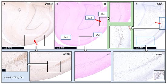 Definition of the pigs’ normal cornu ammonis CA2 and transitions to adjacent regions in the porcine hippocampus. (Upper picture row) (all scale bars: 2.5 mm): (A) AVPR1B: The left image shows arginine vasopressin receptor 1B (AVPR1B) staining. The red arrow highlights the CA1-CA2 transition. (B) HE: The middle image shows hematoxylin–eosin (HE) staining, with CA1 to CA4 labeled. (C) CaBP-Li: The right image presents calbindin-D28K-like (CaBP-Li) staining. The red arrows in the HE and CaBP-Li images show the CA2-CA3 transition, which is also shown enlarged in the upper row, with a green background (cutout). (Lower picture row) The lower row shows cutouts of the images of the AVPR1B, HE, and CaBP-Li staining to highlight the appearance of the CA1-CA2 transition. Scale bar of the AVRBP1 cutout: 50 µM.