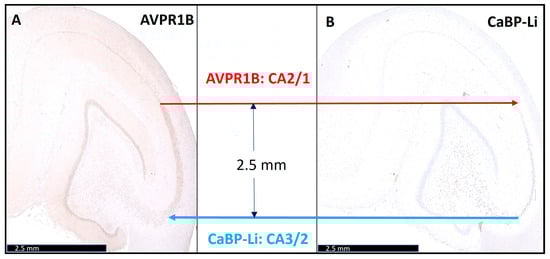 Precise definition of the pigs’ normal length of cornu ammonis (CA2). The left image (A) shows arginine vasopressin receptor 1B (AVPR1B) staining. The red arrow highlights the CA1-CA2 transition. The right image (B) shows calbindin-D28K-like (CaBP-Li) staining. The blue arrow highlights the CA2-CA3 transition. The length of CA2 region is approximately 2.5 mm. Scale bars: 2.5 mm.
