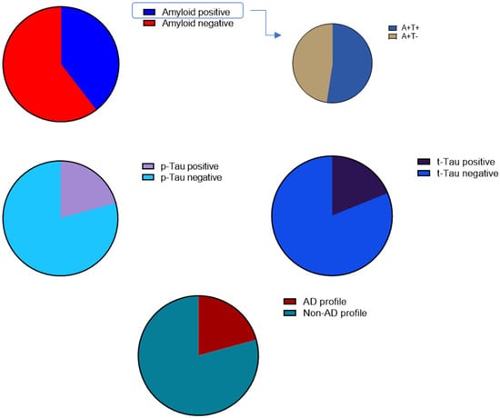 Out of 21 amyloid-positive patients, 11 had an A+T+ profile and 10 had an A+T−. As mentioned above, based on the proposal of the NIA-AA research group for a biological definition of AD, only A+T+ patients were classified as having an AD profile [].