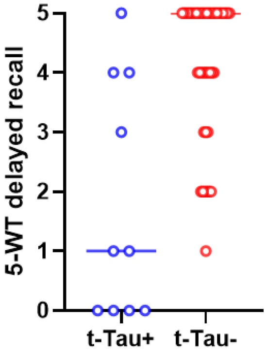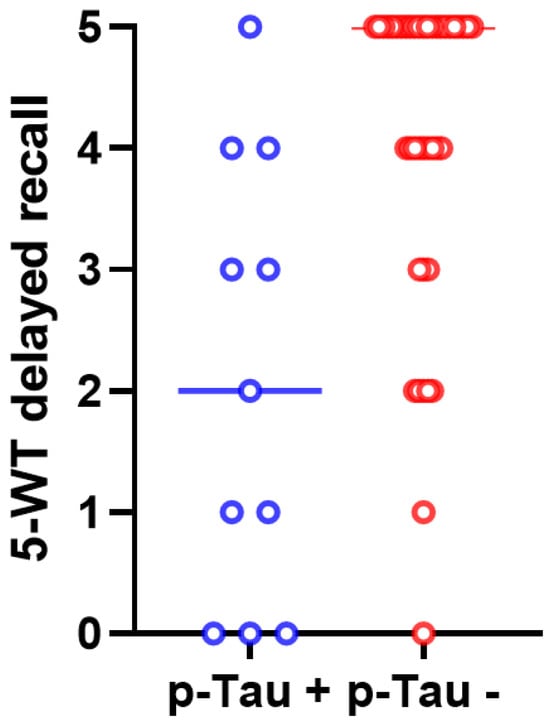 After post hoc analysis (with Bonferroni correction), the difference in delayed recall on the 5-WT between the p-Tau-positive and p-Tau-negative patients remained statistically significant (Figure 2).