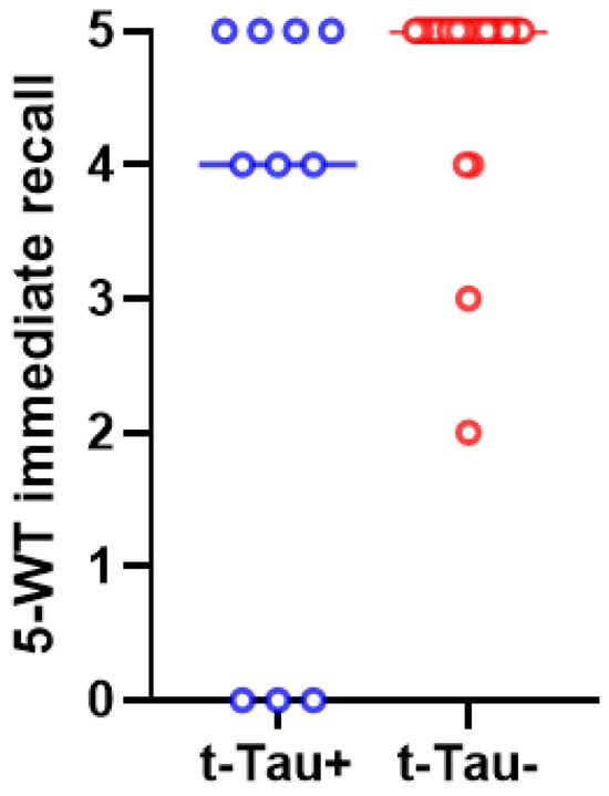 After post hoc analysis (with Bonferroni correction), only the differences in immediate and delayed recall on the 5-WT between the t-Tau-positive and t-Tau-negative patients remained statistically significant (Figure 3 and Figure 4).
