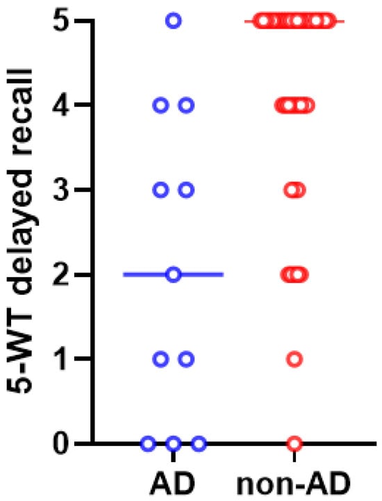 The scores of 5-WT delayed recall differed significantly between iNPH patients with AD (in blue color) and non-AD (in red color) CSF profiles (p = 0.003). The median values and the ranges of these values in the two groups are presented in this graph.