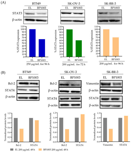 Effect of BP1003 on STAT3 and downstream proteins levels. (A) Representative immunoblots and normalized densitometric levels of STAT3 in BT549, SK-BR-3, and SK-OV-3 cell lines treated with BP1003 or EL. (B) Representative immunoblots and normalized densitometric levels of STAT4 and STAT3 target proteins, Bcl-2 and vimentin, after treatment with BP1003 or EL.