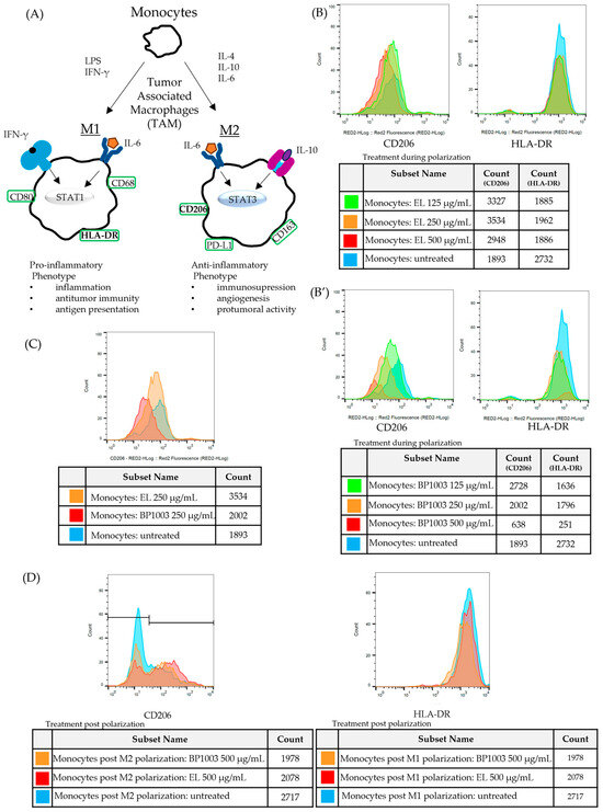 BP1003 reduces M2 monocyte polarization. (A) For in vitro polarization, monocytes were stimulated with LPS and IFNγ for M1 polarization and IL-4 for M2 polarization. (B–D) Representative histograms for expression of surface markers CD206 (M2) and HLA-DR (M1). (B,B′) To assess the effect of BP1003 and EL during polarization monocytes were treated with the indicated dilutions of BP1003 or EL at the same time as polarizing agents for 3 days. (C) BP1003 treatments at 250 µg/mL most efficiently decreased M2 polarization. (D) Neither M1 nor M2 polarized monocytes are affected by BP1003 or EL (500 µg/mL).