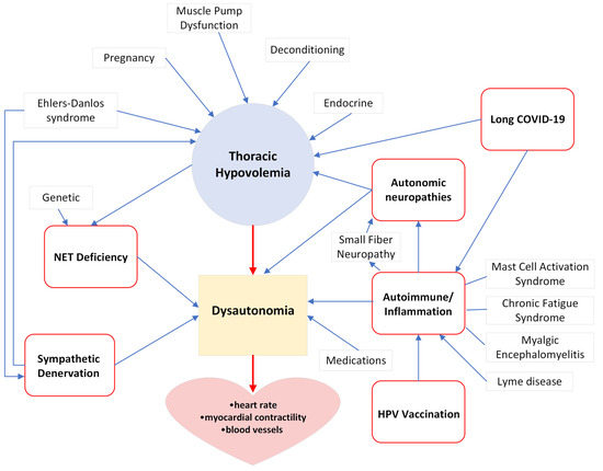 Etiological Factors of POTS. Extended thoracic hypovolemia has the potential to strain the ANS, leading to dysautonomia. Autoimmune responses targeting components of the ANS may trigger dysautonomia. POTS frequently co-occurs with conditions that have inflammatory underpinnings, suggesting inflammatory mechanisms in the pathophysiology of POTS. The diminished venoconstriction resulting from autonomic neuropathies or sympathetic denervation in the lower extremities induces thoracic hypovolemia. The impaired reuptake of norepinephrine due to NET deficiency can result in elevated circulating levels, further contributing to autonomic dysfunction. A decrease in norepinephrine clearance might be attributed to a decline in cardiac output. Molecular mimicry, leading to the formation of cross-reacting autoantibodies, may underlie the risk of POTS associated with HPV vaccination. The mechanisms behind long COVID-19 and POTS may involve hypovolemia, inflammation, and autoimmunity. Additionally, EDS may be linked to POTS due to peripheral neuropathy and thoracic hypovolemia. Endocrine dysfunction, deconditioning, muscle pump dysfunction, mast cell activation disorders, and pregnancy may also contribute to thoracic hypovolemia. Medications may cause dysautonomia. Dysautonomia leads to issues with heart rate regulation, myocardial contractility, and the function of blood vessels. Our research further highlights the significant challenges affecting the heart and circulatory system in POTS patients. Despite the fragmented understanding of POTS risk factors, highlighting a complex interplay of physiological, immunological, and environmental factors, the identification of these diverse factors underscores critical gaps in knowledge, such as the direct involvement of the heart, and offers insights into potential areas for intervention and therapeutic development. Red arrows represent central mechanisms, and blue arrows represent contributing factors.