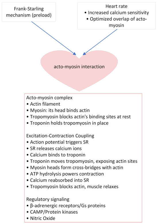 Myocardial function in POTS has received too little research attention to date, particularly regarding subclinical changes without alterations in heart morphology or symptoms. Cardiac contraction is orchestrated through the intricate interaction of the acto-myosin complex and various regulatory mechanisms (Figure 2). At the molecular level, the actin filament and myosin protein interact to form the core of the contraction process. Myosin heads bind to actin, a connection crucial for muscle contraction. This interaction is tightly regulated; tropomyosin blocks the myosin-binding sites on actin filaments in a resting state, while troponin holds tropomyosin in place, ensuring that contraction only occurs upon the appropriate signal. The excitation-contraction coupling mechanism initiates with an action potential that triggers the sarcoplasmic reticulum (SR) to release calcium ions. These ions bind to troponin, causing a conformational change that moves tropomyosin away from the actin binding sites, thereby allowing myosin heads to form cross-bridges with actin. The hydrolysis of ATP then provides the energy necessary for muscle contraction. Subsequently, calcium ions are reabsorbed into the SR, tropomyosin recovers the actin sites, and the muscle relaxes. Regulatory signaling pathways play a pivotal role in modulating cardiac contraction. β-adrenergic receptors, upon activation, interact with Gs proteins, leading to the activation of adenylyl cyclase and the subsequent increase in cyclic AMP (cAMP). This increase in cAMP activates protein kinases, such as Protein Kinase A (PKA), which phosphorylate various proteins involved in calcium handling and contractility, thereby enhancing the heart’s response to stimuli. Additionally, nitric oxide (NO) serves as a key modulator, influencing blood flow and calcium sensitivity in cardiac muscle cells. Collectively, these mechanisms ensure the heart’s ability to effectively respond to varying physiological demands, ensuring the complexity and precision of cardiac muscle regulation [74].