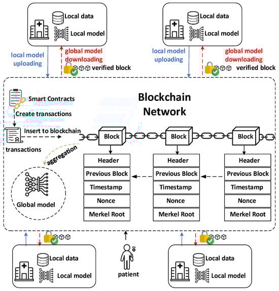The blockchain provides several security features. It facilitates patient-controlled consent management, preventing unauthorized data use. Smart contracts streamline access verification based on these consents. Additionally, the blockchain authenticates healthcare providers to prevent malicious participation. Its immutable ledger ensures the auditability of all model exchanges and aggregations, aiding in anomaly detection. Secure communication through the blockchain prevents data leakage during the federated learning process.