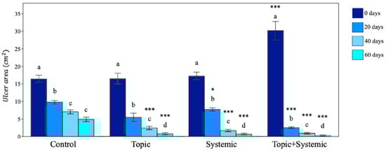 Variation in wound contraction during the planned treatments. The reduction in the wound area (cm2) indicates the speed of re-epithelialization of the wound. Data are expressed as mean ± SD (n = 20). One-way analysis of variance (ANOVA) was performed with Past 4.15. Significant differences within the same group (p < 0.05; ANOVA and Tukey–Kramer test) are reported with different letters in the column. All analyses were considered significant at p < 0.05 within each treatment group. When comparing the control to the topic, systemic, and topic+systemic groups, the significance was *** p < 0.001; * p < 0.05.