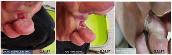 The principal medical researchers measured and photographed all wounds weekly, always with the same photographic equipment (Huawei P30 Leica Quad Camera, Shanghai, China). A sterile ruler, a 125 MEB-6/150 vernier caliper (https://www.classichandtools.com/starrett-125-meb-6150-vernier-caliper/p1551?srsltid=AfmBOorHK0I1Bv91EcxqbsGsbnCEVOv4P3rqnOksI8DHo6JZvzqc3wKj (accessed on 20 August 2024)), and image processing software for surface area and perimeter calculations were used to collect and record wound measurement data. Many patients did not consent to the disclosure of images taken of the wounds being treated. The photographic images taken of patients were considered private data and treated as such. The classification of the observed ulcers was carried out in accordance with international standards, which included the following: Stage I: Intact skin with localized, non-blanchable erythema over a bony prominence. The area may be painful, hard, or soft and warmer or colder than the surrounding tissue. Darkly pigmented skin may not show visible whitening; however, the color of the Stage I ulcer will appear different from the color of the surrounding skin and indicates that the patient is at risk of further tissue damage if the pressure is not relieved. Stage II: A partial thickness wound presenting as a shallow, open ulcer with a red/pink wound bed. It may also present as an intact or open/ruptured blister filled with serum or sero-sanguineous fluid. Fragments of scaly skin may be present, which do not hide the depth of tissue loss. Stage III: Full-thickness wound. Subcutaneous tissue may be visible, but bones, tendons, and muscles are not exposed. Scaling or eschar may be present, but this does not mask the depth of tissue loss. Stage IV: A full-thickness wound with exposed bone, tendon, or muscle. Scaling or sloughing may be present in some parts of the wound bed, but this does not hide the depth of tissue loss.