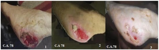 In diabetic patients, hyperglycemia impairs neutrophil function and reduces host defenses []. This result leads to a tendency for bacterial infections that slow down and reduce wound healing. Patients with one or more of these risk factors accelerate the development of wounds that may be slow to heal and predispose to secondary infections. Without treatment, this type of wound can become infected. This can lead to extreme outcomes such as sepsis. The arrest of the tissue repair process of a lesion, linked to an increase in bacterial load, determines the appearance of the first and local signs of inflammation, which can be considered as the beginning of an evolving infection. The application of Citozym® according to the protocol reported in the “Methods Section” has made it possible, in many cases, to control and reduce the increase in germs, allowing the tissue repair process to resume in an almost sterile environment.
