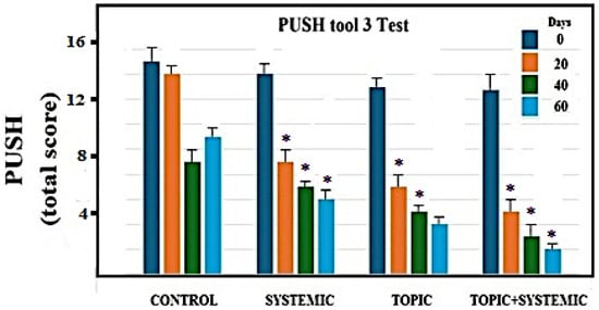 From Figure 7, it can be observed that the total score of the PUSH test in control patients was reduced by 36.17% over 60 days, while for the systemic treatment in the same period, it was reduced by 61.36%. Topical treatment reduced the total PUSH score by 73.1%. The combined treatment was more effective, bringing the total PUSH score to a value of 85%.