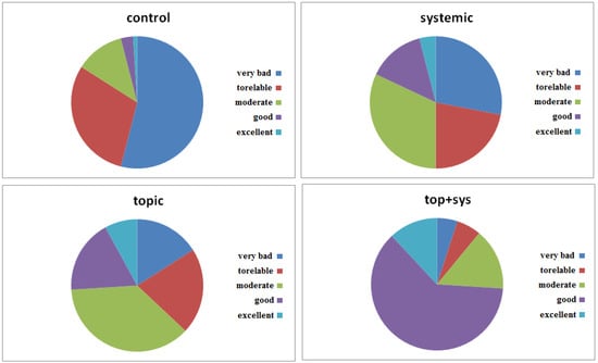 From Figure 8, which represents the QL trend in patients treated with the experimental protocol mentioned, it can be seen that the PU treatment, to which the patients were subjected, not only showed improvement and the healing of the wound but also an increase in the QL of the patient. The test proposed to patients included several questions aimed at highlighting five fundamental points of the QL scale. In particular, the evaluation of the patient’s general condition, both physical and mental, was required. As can be seen from Figure 8, the percentages of positive outcomes were very high. In particular, in patients treated with the combined therapy (topical+systemic), the “Good” level of satisfaction was 62%, followed by “excellent” at 12% and “moderate” at 15%. The “tolerable” and “very bad” percentages reached 6% and 5%, respectively. In conclusion, it was possible to deduce that the proposed treatment was widely appreciated by a large number of patients. These data, when compared with the results of conventional therapy, highlighted the effectiveness of the application of the biodynamic supplement Citozym in the therapy of pressure ulcers. Conventional treatment highlighted a low level of QL with “very bad” percentages of 54% and “tolerable” percentages of 30%. Furthermore, from Figure 8, it is also possible to deduce that the systemic treatment alone was less effective than the topical treatment.