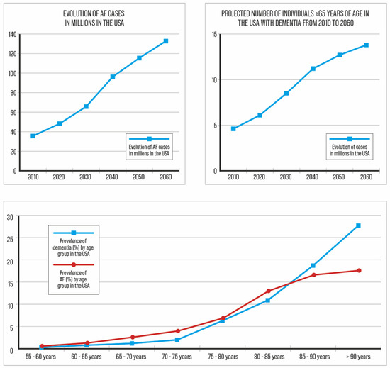 The increasing prevalence and incidence of atrial fibrillation (AF), stroke, and dementia are major public health issues (Figure 1). In 2010, 35.6 million people in the United States of America (USA) had dementia, and this number is expected to reach 65.7 million by 2030 and 115.4 million by 2050 [1]. The worldwide prevalence of dementia is expected to increase by 100% to 250% between 2019 and 2050 [1,2]. Similarly, AF, the most common cardiac arrhythmia, affecting more than 37 million people globally, is expected to increase [3]. (Figure 1). Atrial fibrillation is associated with increased mortality and morbidity, including a 5-fold increased risk of stroke, and shares the same epidemiological evolution and risk factors as dementia [3,4]. Clinical AF is associated with a higher incidence of all types of dementia [5,6,7]. Thus, the early detection of AF-related cognitive impairment should theoretically allow for integrative approaches to prevent the development of dementia.