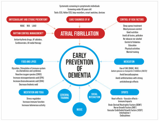 The integrated approach consists of four points, including patient assessment, risk factor management, anticoagulation, and rhythm management. Modifiable factors include cardiovascular risk factors, psychiatric factors, diet, lifestyle, and education [75]. Integrative measures in the prevention and care of dementia aim to maximize cognition and improve quality of life through effective interventions such as physical exercise, intellectual stimulation, or leisure activities to reduce the risk of dementia in later life [76]. The FINGER (Finnish Geriatric Intervention Study to Prevent Cognitive Impairment and Disability) trial randomized 1,260 individuals older than 60 years of age at high risk for dementia to intervention (n = 631) or control (n = 629) [77]. The intervention group consisted of nutritional counselling, exercise, cognitive training, social activities, and the management of metabolic and vascular risk factors. These individuals showed a mean improvement in a composite cognitive measure of executive function and processing speed after 2 years of follow-up. Less cognitive reserve appears to lead to the earlier development of dementia [78,79]. Building brain reserve early in life through education levels and intellectual stimulation could promote cognitive resilience in later life and decrease the rate of dementia [75,78,80]. Modifiable factors are mainly distributed between midlife (age 45–65 years) and later life (age > 65 years). In midlife, the weighted population attributable fractions (PAFs) are 2% for hypertension, 0.8% for obesity, and 9.1% for hearing loss. In later life, the PAF is 5.5% for smoking, 4.0% for depression, 2.6% for physical inactivity, 2.3% for social isolation, and 3.2% for diabetes [76]. To prevent dementia, the National Institutes on Aging at the National Institutes of Health (NIH) recommends controlling high blood pressure, following a healthy diet (mix of fruits and vegetables, whole grains, lean meats and seafood, unsaturated fats such as olive oil, low-fat or fat-free dairy products, and less consumption other fats and sugars), maintaining a healthy weight, and staying physically active (at least 150 min of moderate-intensity physical activity each week) [81]. The study by Bherer et al. found a significant improvement in cognition in patients after 20 weeks of aerobic and resistance training [82]. Quality and quantity of sleep are also modifiable factors; 35% of the population sleeps less than 7 h a night, whereas 8 h of sleep a night is recommended. Sleep disorders like sleep apnea should also be corrected. Other factors include preventing head injuries, taking steps to prevent falls, avoiding or limiting alcohol, stopping tobacco use, and avoiding some medications (Figure 2). In the retrospective study by Proietti et al., SGLT2i reduced the risk of cerebrovascular events, incident dementia, heart failure, and death in patients with concomitant AF and diabetes mellitus type 2 [83].