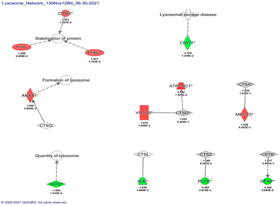 In terms of protection from endoplasmic reticulum stress, it indicates that there are intracellular mechanisms for counteracting lysosomal dysfunction and cellular trafficking: upregulation of Annexin 1 (ANXA1), prohibitin (PHB), transmembrane emp24 domain-containing protein TMED10, and calnexin (CANX). For example, annexin 1 (ANXA1) (FC = 1.63) and prohibitin (PHB) (FC = 1.56) are related to membrane remodeling for vesicular export and found in endo-lysosomal pathways [112,113]. Furthermore, PHB upregulation decreases lysosomal and mitochondrial dysfunction that might lead to cargo leakage from these organelles, promoting the protection of lysosomes [114]. PHB is essential for mitochondrial damage by modulating oxidative stress [115]. CANX protects against endoplasmic reticulum stress, protein retention, and folding [116]. TEMD10 controls Rab7-LAMP1-positive lysosomes where cathepsin D/B fractions are present for protein and cargo exportation [117]. Transmembrane emp24 domain-containing protein (emp24) indicates that there are intracellular mechanisms for counteracting lysosomal dysfunction and cellular trafficking and promotes vesicular transport among the endoplasmic reticulum and mitochondria [118]. In the same manner, TUB1A interacts with spinster protein on the lysosomal membrane to protect them from leakage [119], and VDAC3 modulates mitochondrial-lysosomal calcium leakage, an essential step for permeabilization [120].