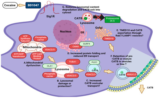 Effects of Sigma-1 receptor agonist BD1047 in preventing HIV infection and cathepsin B release from HIV-1-infected MDM exposed to cocaine. Proposed model on the effect of BD1047 in reversing CATB processing, trafficking, and secretion. Upregulated (red) and downregulated (green). (A) Mitochondrial dysfunction, which is evident with the upregulation of selected proteins such as ATP synthase subunits F0 complex (C1–C4 and D), phosphate carrier protein, voltage gate dependent channel proteins (VDAC), ATP/ADP translocase 4, and ATP lipid binding proteins. (B) Mitochondrial dysfunction influences lysosomal dysfunction and damage as well. Upregulation of phosphate carrier protein and tubulin 1A (TUBA1) indicates protecting lysosomal integrity. Upregulation of proteins such as VDAC suggests a major factor in lysosomal permeabilization and cathepsin B leakage. Downregulation of Obg-like ATPase protein (OLA1) suggests a protection mechanism against lysosomal leakage. (C) Upregulation of VDAC promotes vesicular transport into other organelles. (D) Increased protein folding but reduced ER transport. Calnexin (CANX) suggests increased protein folding, processing, and intracellular transport of some proteins, including CATB. Downregulation of surfeit locus protein 4 (SURF4) suggests a concentration of proteins in the ER. (E) Upregulation of transmembrane protein emp24 (TMED10) suggests possible movement of Rab7/LAMP1 vesicles for exocytosis. (F) Upregulation of ANXA1 suggests a binding of these proteins with pro- and mature CATB either in vesicles or in free form at the cellular membrane or in the cytoplasm. (G) BD1047 reduces proteasome activation, indicating that CATB is probably retained in lysosomes and their cargo is not processed through autophagy, where CATB is exposed to the cytosol or fragmented. Model made on BioRender Premium software (https://www.biorender.com/pricing, accessed on 1 August 2024) with available permission for publishing.