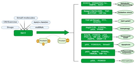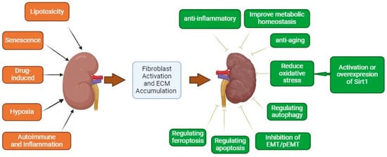 Emerging data indicate that upregulation of SIRT1 expression may mitigate renal fibrosis. Collectively, SIRT1 exhibits beneficial effects in the management of renal fibrosis, suggesting its potential as a therapeutic target for this condition [131]. However, the effects of SIRT1 on different cells vary with distinct mechanisms of action. Here, we have counted some potential activations and inhibitions of SIRT1 (Figure 4).