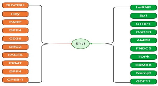 The proteins studied that can potentially activate or inhibit SIRT1. Activation and inhibition effects are displayed in green and red arrows.