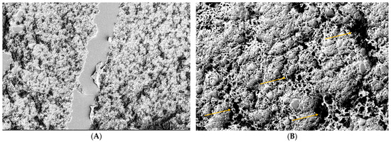 Patient 3 at T0: high microvillar distribution at 800× (A) and 8000× (B) magnification. At 8000× (B), we can see how microvilli hold the precorneal tear film, which in the other patients is not visible (yellow arrows). This is an indicator of good condition (grade 0–1).