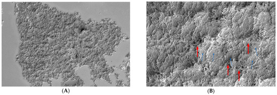 Patient 3 at T30: great distribution of the tear substitute on ocular surface at 800× (A) and 8000× (B) magnification. The density of microvilli grew after the treatment (blue arrow), indicating a complete normalization of the ocular surface, with evidence of Trimix® strongly linked to the microvilli structures (red arrows).