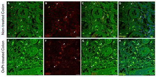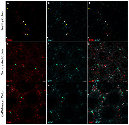 Double staining for MAP2 (red) and GFAP (cyan) in human enteral nervous system. Panels (A–C): MAP2+ cells (white arrowheads) and GFAP+ cells (yellow arrowheads) in control with healthy colon. Panels (D–F): healthy colon areas from not-yet-treated CRC patients; most of the cells show both MAP2+ and GFAP+ staining (green arrowheads) and a few MAP2+ cells and GFAP− cells (white arrowheads). Panels (G–I): samples from OxPt-treated CRC patients; MAP2+ and GFAP+ staining (green arrowheads), a few MAP2+/GFAP− cells (white arrowheads) or GFAP+/MAP2- cells (yellow arrowheads). Bar = 20 µm.