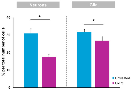 Our results in humans show a decrease in the number of ENS neurons and ENS glial cells (EGCs) (Figure 2) following OxPt-based chemotherapy, in agreement with previous studies performed in mice [9], mostly those expressing nitric oxide (NO) synthase [27]. In mice, OxPt treatment induced a significant reduction in the total number and proportion of ChAT-IR neurons, with no significant differences in VAChT-IR nerve fiber density observed in the myenteric plexus of the colon following oxaliplatin treatment when compared with the vehicle-treated cohort [9].