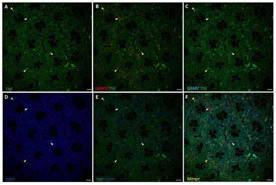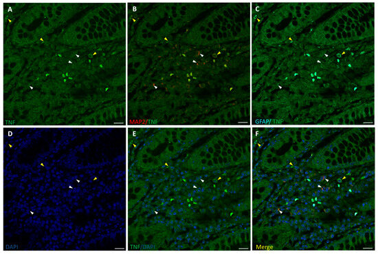 Staining for TNF-α (green), MAP2 (red), and GFAP (cyan) in human non-tumor (healthy) colon from untreated CRC patients. Panels (A–C): TNF-α staining, MAP2+ (white arrow-heads), and GFAP+ (yellow arrowheads) of ENS surrounding colon crypts. Panels (D–F): DAPI, DAPI/TNF-α staining, and merge of DAPI/TNF-α/MAP2/GFAP. Specific fluorescence for TNF-α was positive only in a few GFAP+ cells (C). Bar = 20 µm.