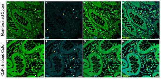 Staining for TNF-α (green), MAP2 (red), and GFAP (cyan) in human non-tumor (healthy) colon from OxPt-treated CRC patients. Panels (A–C): TNFα+/MAP2+ cells (white arrows) and TNFα+/GFAP+ cells (yellow arrows). Panels (D–F): DAPI, DAPI/TNF-α staining, and merge of DAPI/TNF-α/MAP2/GFAP. Bar = 20 µm.