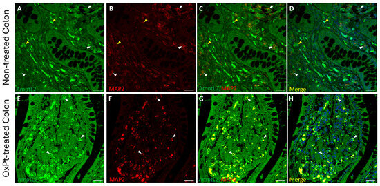 As the first step, we checked neurons and glial populations in ENS by fluorescence immunohistochemistry and confocal microscopy with MAP2 and GFAP markers in healthy colon areas from untreated and OxPt-treated CRC patients (Figure 1). Strikingly, some cells co-stained for both MAP2 and GFAP markers were found in samples from untreated and OxPt-treated CRC patients.