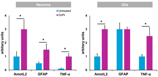 Specific fluorescence signal for AmotL2, GFAP, and TNF-α in neurons and glia from untreated and OxPt-treated CRC patients. Untreated = samples from patients previous to chemotherapy. OxPt = samples from patients after chemotherapy. The data are expressed as the mean ± SD. * p < 0.01.
