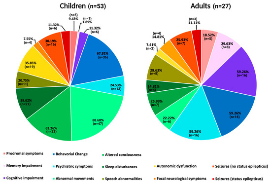 In contrast, psychiatric symptoms, behavioral change, and cognitive impairment were the most frequent symptoms in the adult cohort, all occurring in 59% (n = 16) of the patients, with the latter two significantly more often in adults than children (Table 1).