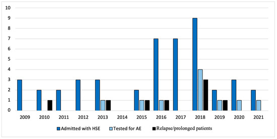 An overview of patients with HSE, how many had a relapsing/prolonged disease course, and the frequency of AE autoantibody testing performed each year from 2009 to 2021 can be seen in Figure 4.