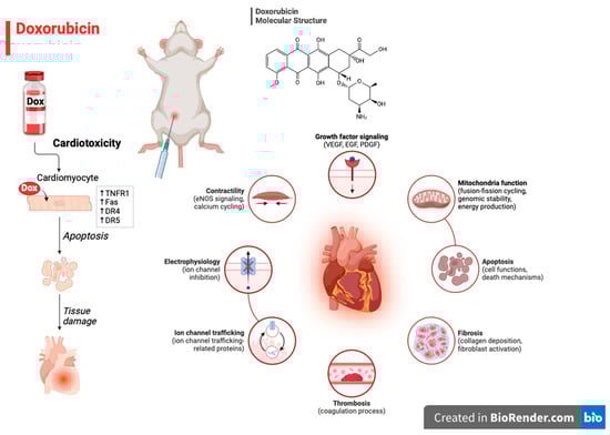 Chronic cardiac failure was replicated using a doxorubicin model [26]. The doxorubicin pharmacological model of chronic heart failure (CHF) is thought to be the most successful, causing most animals to develop severe and progressive CHF. When rats are given doxorubicin intraperitoneally at a cumulative dose of 15 mg/kg, given in 6 injections over a 14-day period, their left myocardium contracts less, its eccentric remodeling decreases, and progressive chronic heart failure develops. Figure 1 describes doxorubicin-induced cardiotoxicity mechanisms.