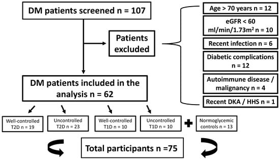 Seventy-five individuals in total were included in the study divided into five subgroups as follows: well-controlled T2D: n = 19; uncontrolled T2D: n = 23; well-controlled T1D: n = 10; uncontrolled T1D: n = 10; and normoglycemic controls: n = 13. Figure 1 presents the study selection flow chart.