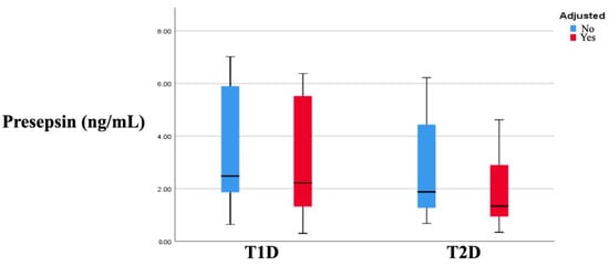 Differences in the presepsin levels between the T1D and T2D groups adjusted and unadjusted for the status of glycemic control. Abbreviations: T1D: type 1 diabetes; T2D: type 2 diabetes.