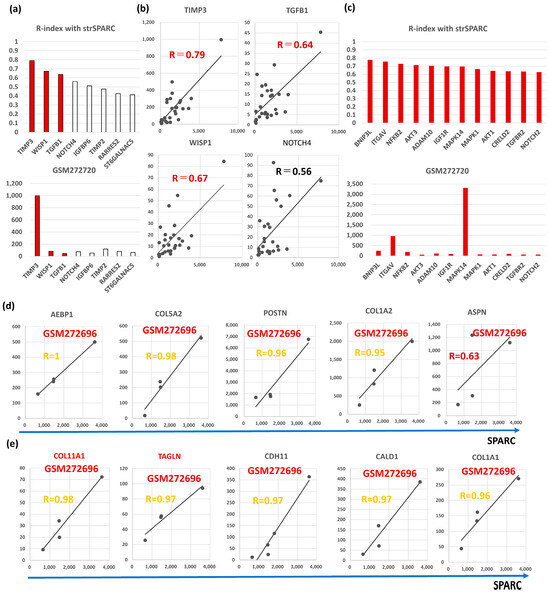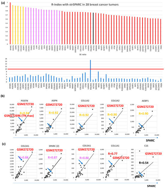 Finally, we explored CAFGs in triple-negative BC (TNBC), although they were only in four cases. Among the BC CAFGs with R-index with strSPARC = 0.9 or beyond, AEBP1, COL5A2, POSTN, and COL1A2 again exhibited high R-index = 0.9 or beyond (Figure 5d). On the other hand, the additional 5 genes showed a high R-index = 0.9 or beyond (Figure 5e), and COL11A1 and TAGLN expressions as shown in red letters were uniquely associated with SPARC expression in cancer stroma of the TNBC tumors (both R-index below 0.6 in total BC). The highest expression amounts of TNBC are shown in Figure 1b,c. As COL11A1 is a myCAFs marker [66], TNBC may be molecularly characterized by myCAFs accumulation in contrast to other BC.