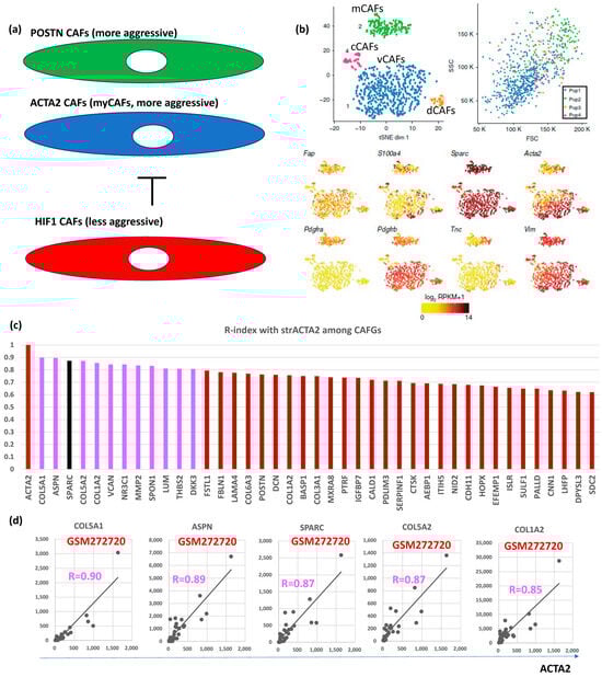 BC CAFGs and current understanding its functional relevance. (a) Relationship between CAFs expressing POSTN and/or ACTA2 (myCAFs) and CAFs expressing HIF1A. (b) scRNA analysis was performed on mesenchymal cells from mouse breast cancer and showed that they could be classified into 4 CAFs categories (vascular CAFs-vCAFs, matrix CAFs-mCAFs, cycling-cCAFs, and developmental CAFs-dCAFs). Well known CAFs markers (FAP, SPARC, ACTA2, and VIM) were expressed in all 4 CAFs, while PDGFRA was expressed only in mCAFs (this figures was made from reference [3]). (c) Correlation coefficient (R = 0.6 or beyond) between CRC CAFGs and strACTA2 in BC. (d) Representative correlation of CRC CAFGs associated with ACTA2 expression in cancer stroma.
