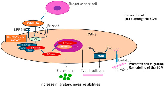 CAFGs collagens in BC and novel therapeutic potential. Adipocyte-derived fibroblasts adjacent to breast tumor cells increase secretion of fibronectin and collagen I, promoting migration and invasive potentials, which can be dependent on activation of the Wnt/β-catenin pathway. Endo180 promotes cell migration and ECM remodeling by collagen uptake. PYCR1 is a key enzyme in proline synthesis and is involved in the production of ECM that promotes tumorigenesis and may be a therapeutic target.