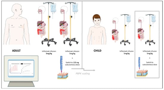- Malik, P.R.V.; Edginton, A.N. Physiologically-Based Pharmacokinetic Modeling vs. Allometric Scaling for the Prediction of Infliximab Pharmacokinetics in Pediatric Patients. CPT Pharmacomet. Syst. Pharmacol. 2019, 8, 835–844. [Google Scholar] [CrossRef]