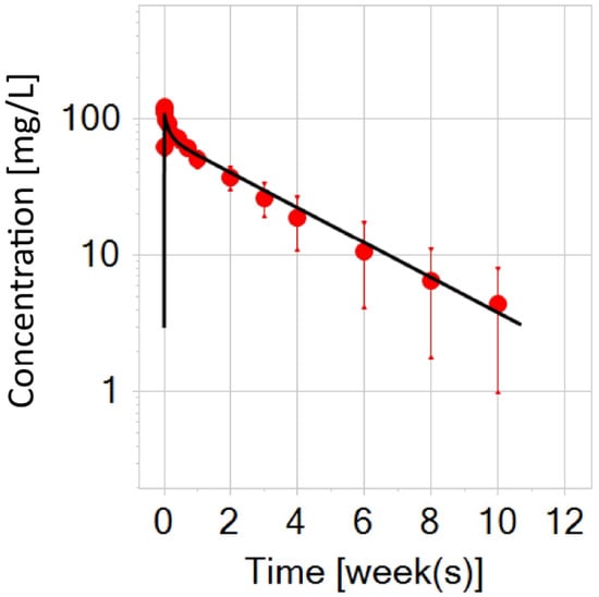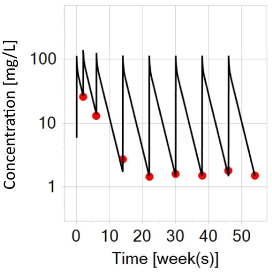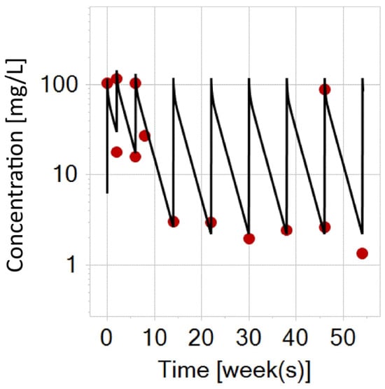 Infliximab PBPK simulation on a semi-logarithmic scale for a typical older child with IBD (14-year-old, 60 kg) after switching to a subcutaneous dose of 120 mg (black curve) at week 6. The red dots represent trough concentrations digitized from the trial data in adult patients post-switching to 120 mg subcutaneous infliximab.