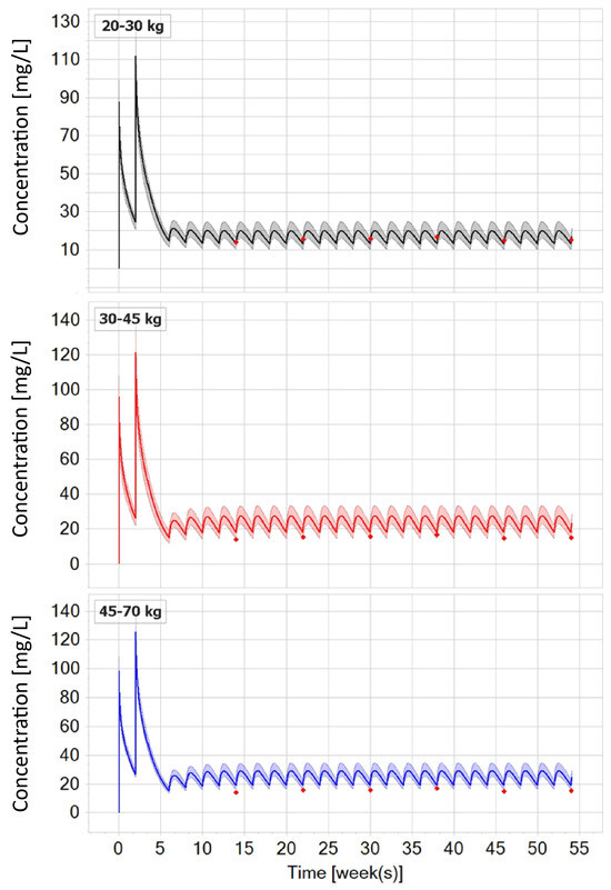 In the final exploration scenario, the goal was to utilize PBPK simulations for proposing the suitable subcutaneous dose (post-switching) in the pediatric population across the approved age range for the intravenous route (6–18 years), stratified into three weight bands based on estimated weight by age [29]: 20–30 kg, 30–45 kg, and 45–70 kg (Figure 9, top, middle, and bottom image, respectively). Each weight band contained 50 simulated pediatric patients (i.e., 150 in total across the simulated age ranges). As already mentioned, given the absence of real-world clinical data for pediatric patients, trough concentrations from a typical adult patient after switching to 120 mg were used as the target exposure metric that would guide the choice of a corresponding subcutaneous dose for each weight band (if such administration were to exist). Figure 9 shows the median concentration and simulated prediction interval (5th–95th percentile) for each weight band along with the corresponding PBPK-model-informed dose suggestion: 40 mg (top prediction), 80 mg (middle prediction), and 120 mg (bottom prediction).