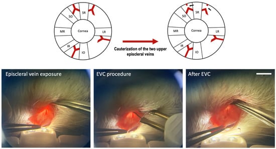 Many experimental animal models have been established to study glaucoma pathophysiology and treatment. One of the most used models, probably because it best recapitulates the most common human form of glaucoma (POAG), is the episcleral vein cauterization (EVC) model, which was first proposed in 1995 []. This murine model has allowed significant advances in glaucoma knowledge, has been reproduced by multiple research groups [,,], and has also been applied to other mammalian species [].