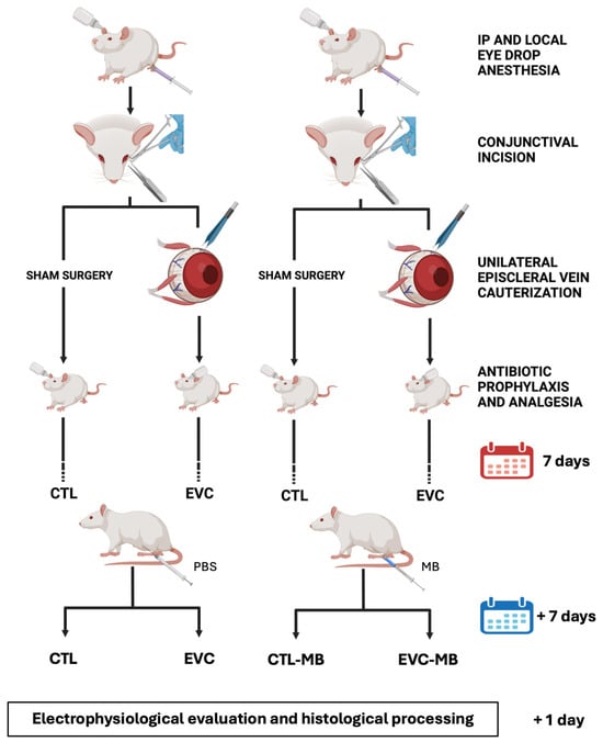 Seven days post-surgery, half of the rats started intraperitoneal treatment with 2.0 mg/kg MB, while the other half received the same volume of vehicle (PBS). This design generated four experimental eye groups (Figure 2): (i) sham-operated, injected with vehicle (CTL), (ii) EVC-operated, injected with vehicle (EVC), (iii) sham-operated, injected with MB (CTL-MB) and (iv) EVC-operated, injected with MB (EVC-MB).