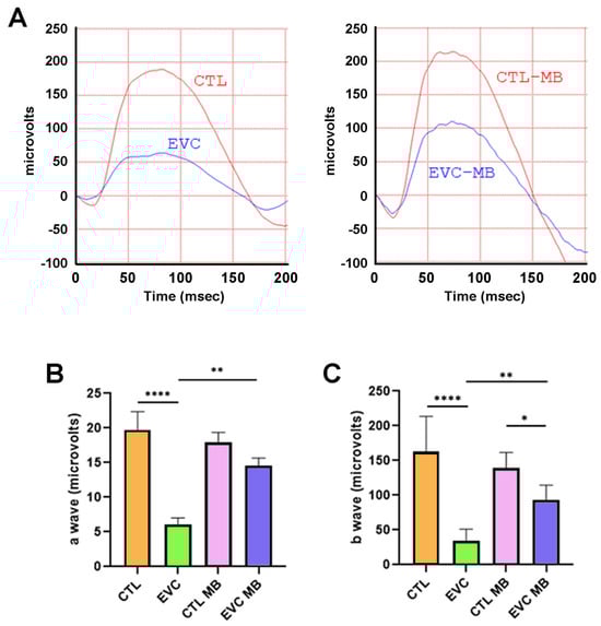 Scotopic ERG showed that those eyes subjected to the EVC procedure had a significant (p < 0.0001) reduction of the a- and b-wave amplitude compared to control sham-operated eyes (CTL group) (Figure 3A–C). Treatment with MB of sham-operated eyes (CTL-MB) had no impact on these parameters (Figure 3A–C). On the other hand, treatment with MB of eyes subjected to EVC (EVC-MB) resulted in a significant preservation of the a-wave amplitude (p = 0.0059) and b-wave amplitude (p = 0.0010) versus the EVC group (Figure 3A–C).