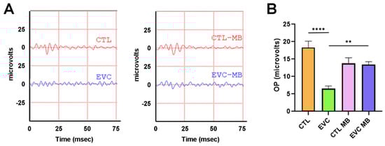 Similar observations were made when studying the OP recordings. Compared to controls (CTL), EVC surgery produced a significant (p < 0.0001) loss of complexity in the OP patterns whereas MB treatment significantly (p = 0.0046) preserved OP waveform complexity in a manner undistinguishable from controls. Similarly to the a- and b-waves, application of MB to sham-operated controls had no impact on the OPs (Figure 4A,B).