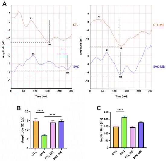PERGs were also recorded to evaluate with higher sensitivity the RGCs’ function and integrity. Two main parameters were evaluated because of their relevance for glaucoma [,]: amplitude and implicit time of the N2 wave (Figure 5A). Eyes subjected to EVC surgery presented a significant (p < 0.0001) reduction in N2 amplitude in relation to the controls (CTLs). In contrast, treatment of eyes subjected to EVC with MB (EVC-MB) resulted in a significant (p < 0.0001) preservation of N2 amplitude, with values that were undistinguishable from the controls (CTL-MB). As with regular ERGs, MB had no effect on sham-operated eyes (Figure 5A,B). In the case of N2 implicit time, EVC caused a significant (p < 0.0001) delay in this parameter. The application of MB was not able to induce a significant recovery of N2 implicit time (Figure 5A,C).