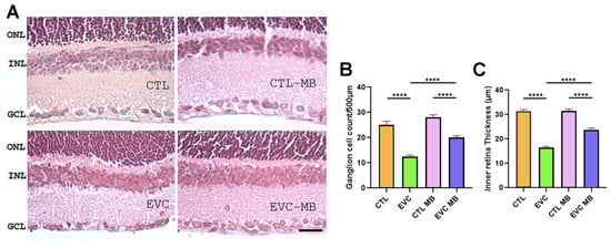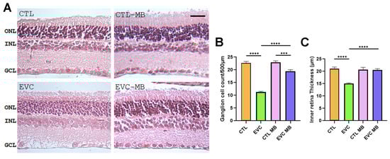 Regarding IR thickness, there was also a significant (p < 0.0001) thinning of this layer generated by EVC surgery (Figure 6A,C). MB treatment (EVC-MB group) completely prevented (p < 0.0001) this modification and was indistinguishable from the controls (CTL-MB). As with other parameters, MB had no effect on sham-operated eyes (Figure 6A,C).