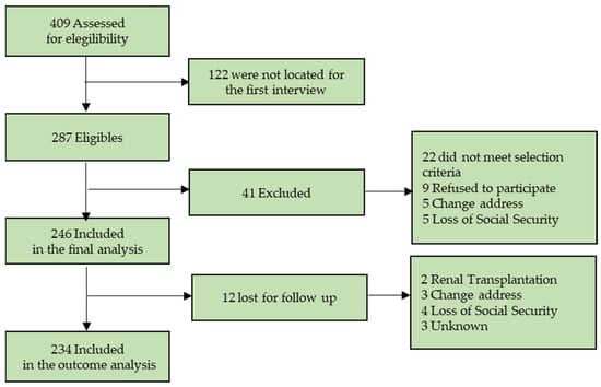 Figure 1 shows the recruited patient flow chart: 409 patients were assessed for eligibility at the dialysis centers in Mexico City and surroundings; 122 patients were excluded because they could not be located, and 287 were eligible, of which, 41 were excluded because of several causes: 22 did not meet the selection criteria, mainly because of age, catheter dysfunction, peritonitis, and hospitalizations during the previous month; 9 refused to participate; 5 moved to another city; and 5 lost Social Security coverage. Thus, 246 patients were included in the analysis, 12 were lost for follow-up: 2 had a kidney transplant, 3 changed addresses, 4 lost Social Security, and 3 withdrew from the study for unknown reasons. A total of 234 patients were included in the outcome analysis.