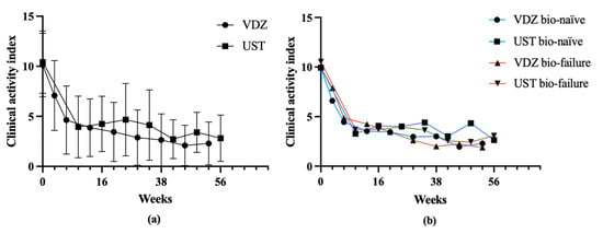 Change in Lichtiger clinical activity index (CAI) after induction of vedolizumab (VDZ) and ustekinumab (UST) (a). Change of CAI in bio-naïve and bio-failure groups (b).