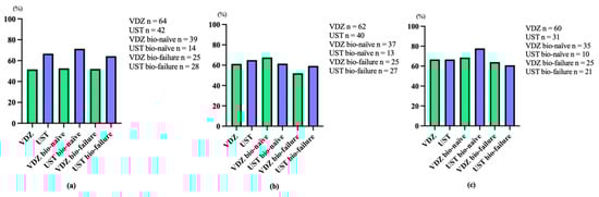 Clinical remission rates with vedolizumab (VDZ) and ustekinumab (UST) at weeks 6 and 8 (a), at weeks 22 and 24 (b), and at weeks 54 and 56 (c).